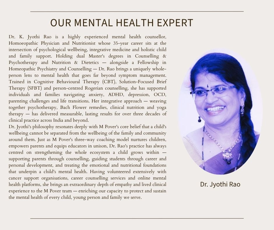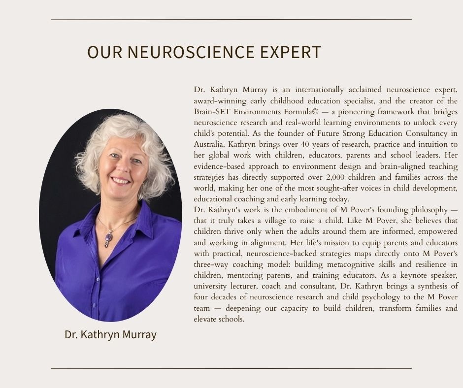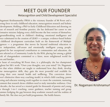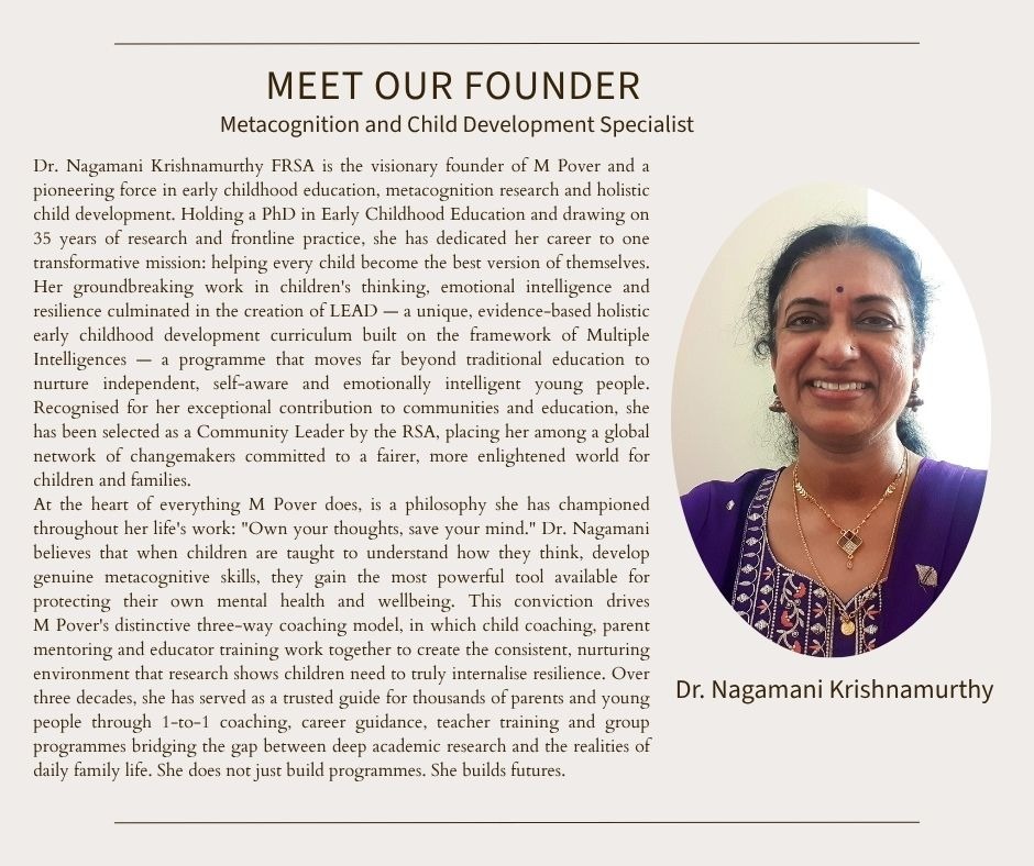 We envision a future where no child is left to navigate the complexities of growing up alone — where the adults in their lives, at home and in school, are equipped, empowered and working together. At M Pover, we are building that future one child, one family and one school at a time. Through evidence-based coaching grounded in metacognition, neuroscience and emotional intelligence, we are creating a generation of young people who know how they think, trust how they feel, and are resilient enough to face whatever the world asks of them.